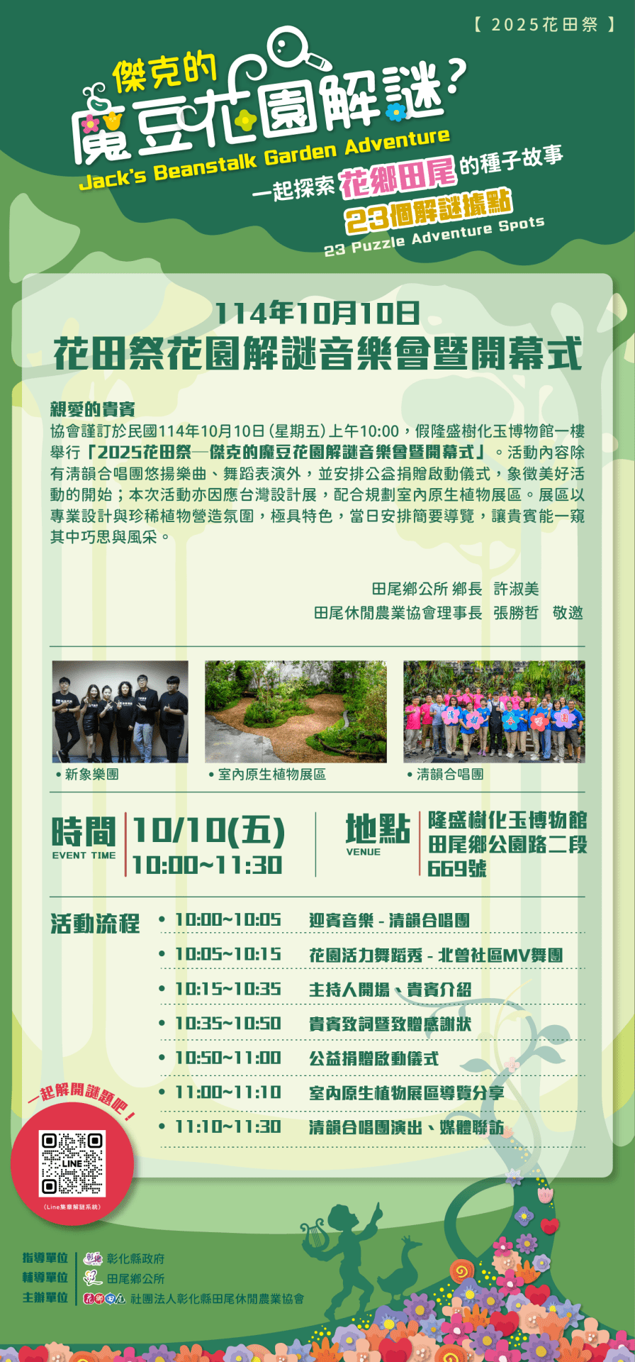 感謝一路支持的夥伴們!今年我們首次集結 24家在地解謎業者,共同參與花田祭開幕記者會,一起揭開「魔豆花園」的奇幻序幕。114年10月10日 10:00開幕記者會暨剪綵儀式,大家與我們一起見證,屬於田尾的數位時刻正式展開!