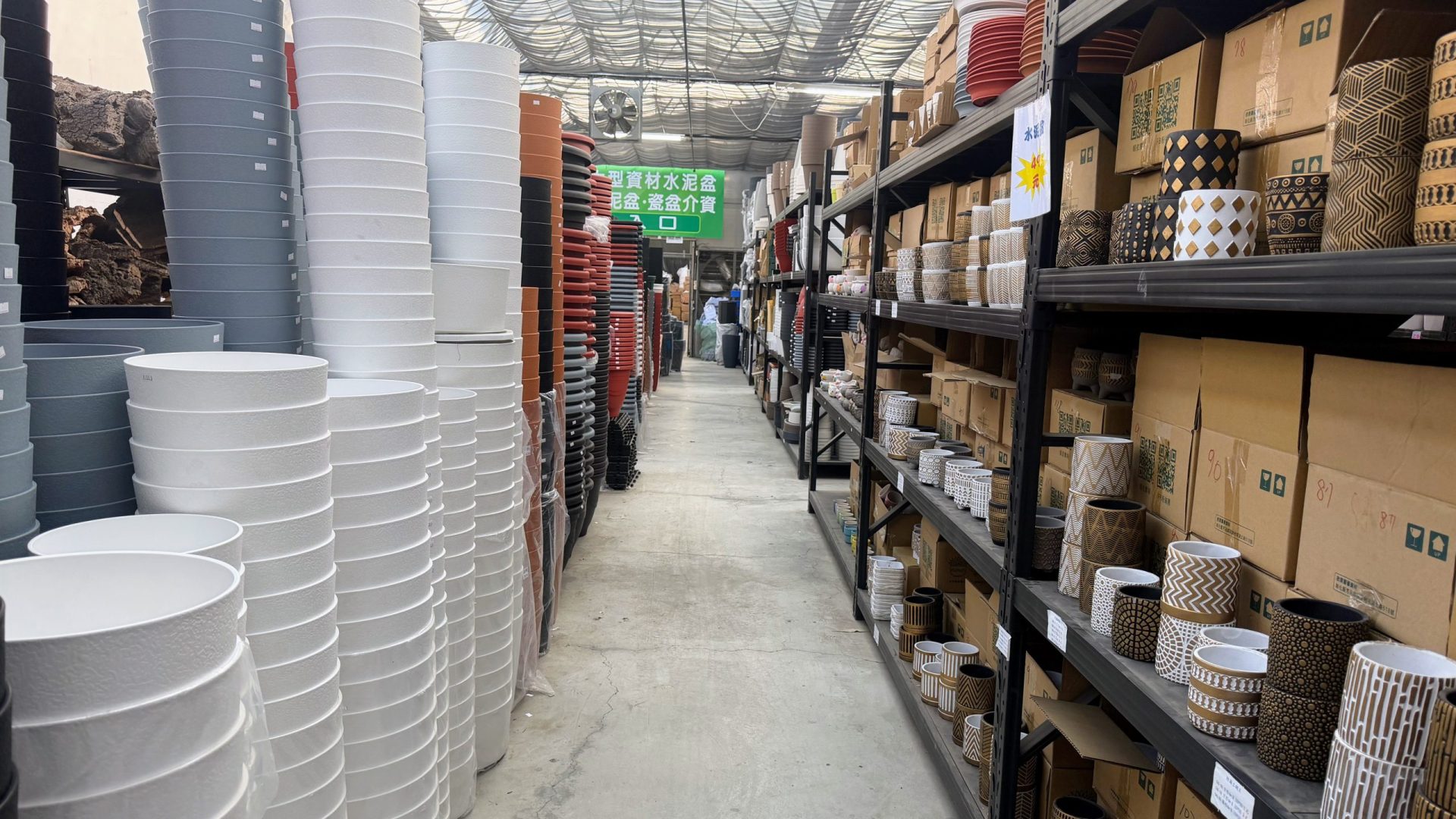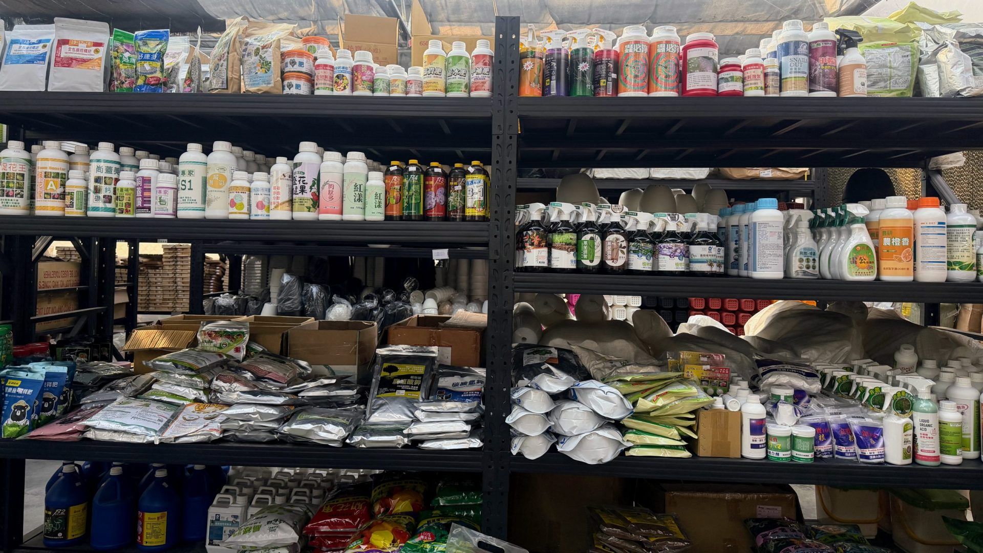 進門之後才發現,店內另有乾坤。後方空間擺放著各式塑膠盆與陶盆,層層堆疊,規格齊全。老闆提到,目前仍在持續擴充區域,未來將加入更多水泥盆、素燒盆,以及不同功能屬性的栽培介質。
